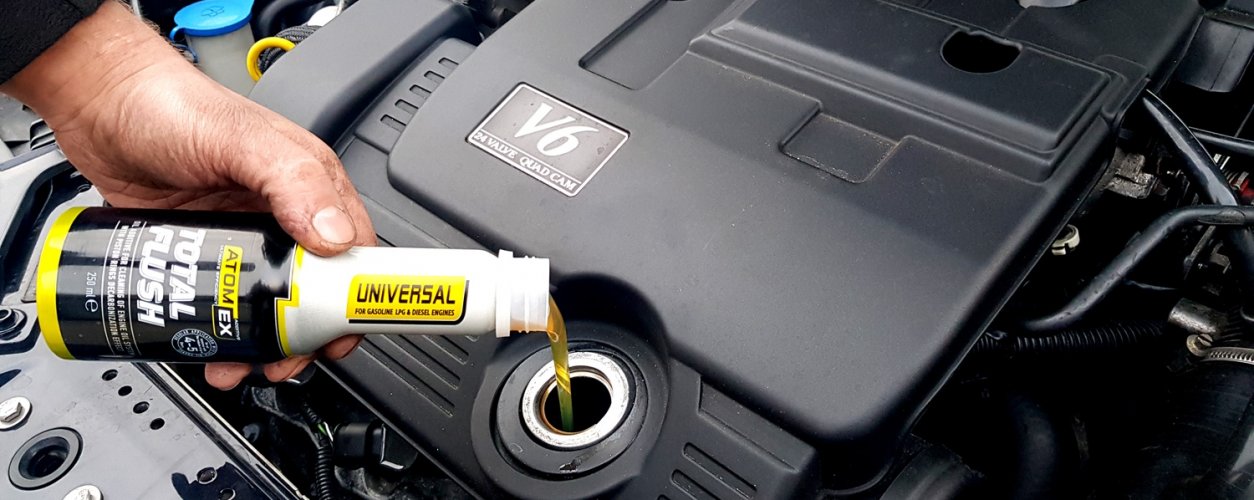 O flushing é a limpeza química do sistema de lubrificação do motor para eliminar a borra, que é o acúmulo de resíduos de óleo oxidado. O procedimento consiste na aplicação de um solvente com alto teor de aditivos detergentes que dissolvem as impurezas impregnadas para limpar o motor.