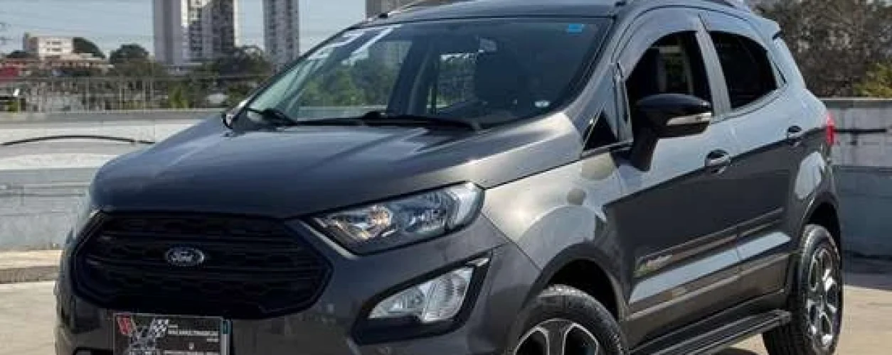 Versões: É possível encontrar as versões LX e EX, anos 2018 ou 2019, dentro do orçamento. A versão EX é mais completa, com itens como ar digital e paddle shifts. Pontos fortes: A modularidade dos bancos traseiros permite carregar objetos de diversos tamanhos, tornando o HR-V extremamente versátil. O espaço interno é excelente e a qualidade de construção é notável. Pontos fracos: O motor 1.8 de 140 cv, acoplado ao câmbio CVT, prioriza o conforto e pode parecer lento em retomadas. A central multimídia das versões mais antigas é datada. Consumo médio (Etanol/Gasolina): 7,7 km/l / 11 km/l (cidade) e 8,6 km/l / 12,3 km/l (estrada). Média de preço: Um HR-V EX 2019 pode ser encontrado na faixa de R$ 105 mil. Acesse nossa Tabela fipe. 9. Ford EcoSport Freestyle 1.5 AT (seminovo)