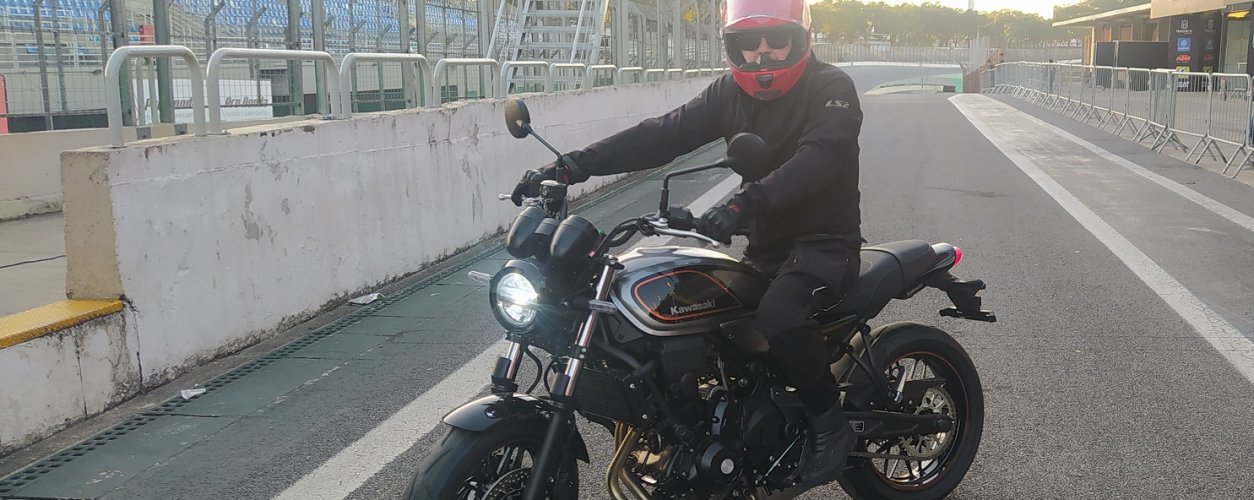 Nosso test-ride com a "Kawa' Z 650 RS foi rápido e quase na surdina. Foram apenas três voltas no Autódromo de Interlagos, avisados de que os pneus Dunlop Roadsport 2 (medidas 120/70 R17 na frente e 160/60 R17 atrás) ainda tinham um pouco de "cera" - já que a moto estava praticamente zerada. Então, nada de abusos.
