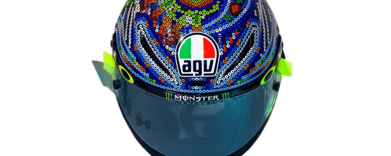 A cada ano Valentino Rossi mostra um novo design de capacete, sempre com pinturas irreverentes e chamativas. Desta vez o grafismo escolhido para os testes de inverno remete à tradição mexicana do povo Huichol e foi pintado à mão.