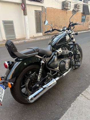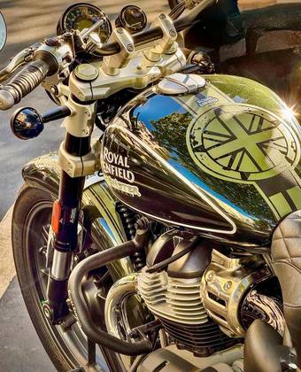 Mas a Shotgun é uma bobber - tem banco solo, traseira "caidinha" com lanterninha redonda tipo jipe (igual à da Meteor 350), para-lama traseiro bem arredondado e rente ao pneu, e ainda tanque ao estilo "peanuts" das antigas Harley-Davidson Sportster 883.