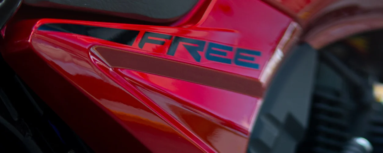O design da Free 150 é até interessante. O farol dianteiro copia o esquema triangular invertido e bipartido que já vimos em algumas motos da KTM - marca premium austríaca -, e a rabeta é simpática e já vem com bagageiro. O protetor de motor e pernas tem design mais exótico, meio à moda indiana, mas cumpre seu papel justamente por ter dimensões generosas e barra horizontal central. As cores disponíveis são preta ou vermelha.