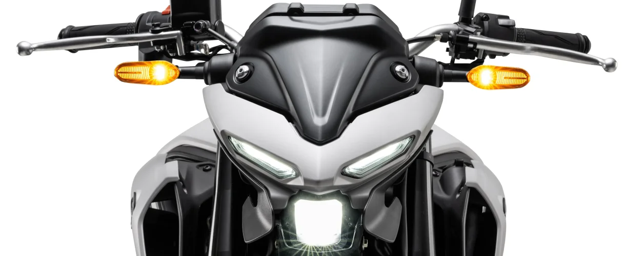 Na linha 2025 são muitas as novidades. A começar pelo design: a moto ganhou, por exemplo, um novo conjunto ótico com o aspecto robótico que tem sido adotado pela marca em vários modelos. Passou a ter uma moldura frontal que embute duas luzes de rodagem diurnas (DRLs) afiladas e, mais abaixo, o farol principal na forma de um projetor de LED. Aliás, toda a iluminação da moto, agora, é com LEDs.