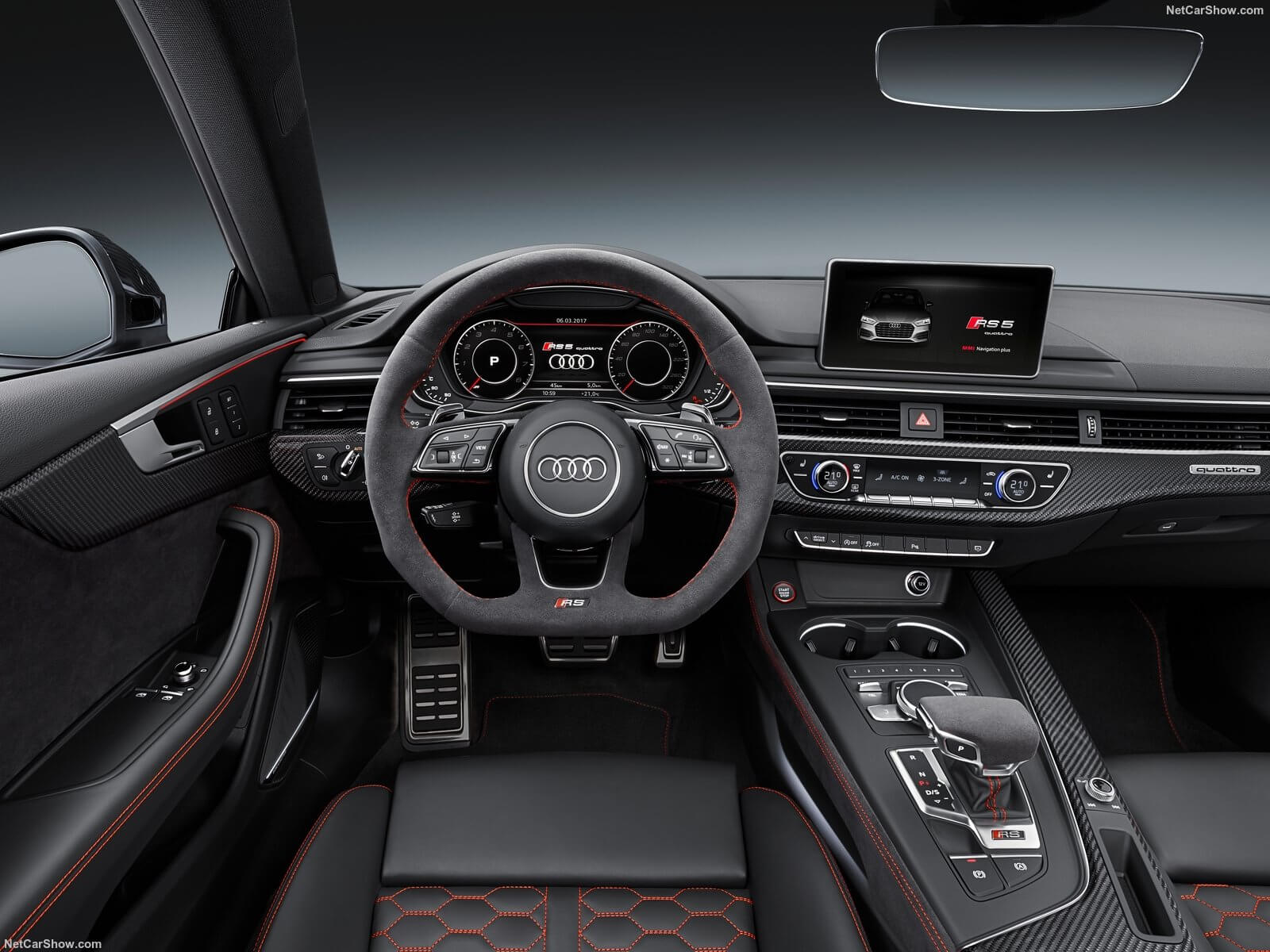 O RS5, no entanto, tem outros predicados para disputar com os rivais BMW M4 e Mercedes-AMG C63 Coupé. O visual é agressivo e tradicional da linha RS. As entradas de ar têm estrutura em colmeia que se juntam a generosa grade Singleframe. As caixas de rodas estão 15 milímetros maior para abrigar as rodas de 20 polegadas. Atrás, as lanternas afiladas incorporam pequenas entradas de ar, além do difusor e das saídas de escapamento ovais. Na tampa do porta-malas também há uma discreta aleta integrada e feita em fibra de carbono.