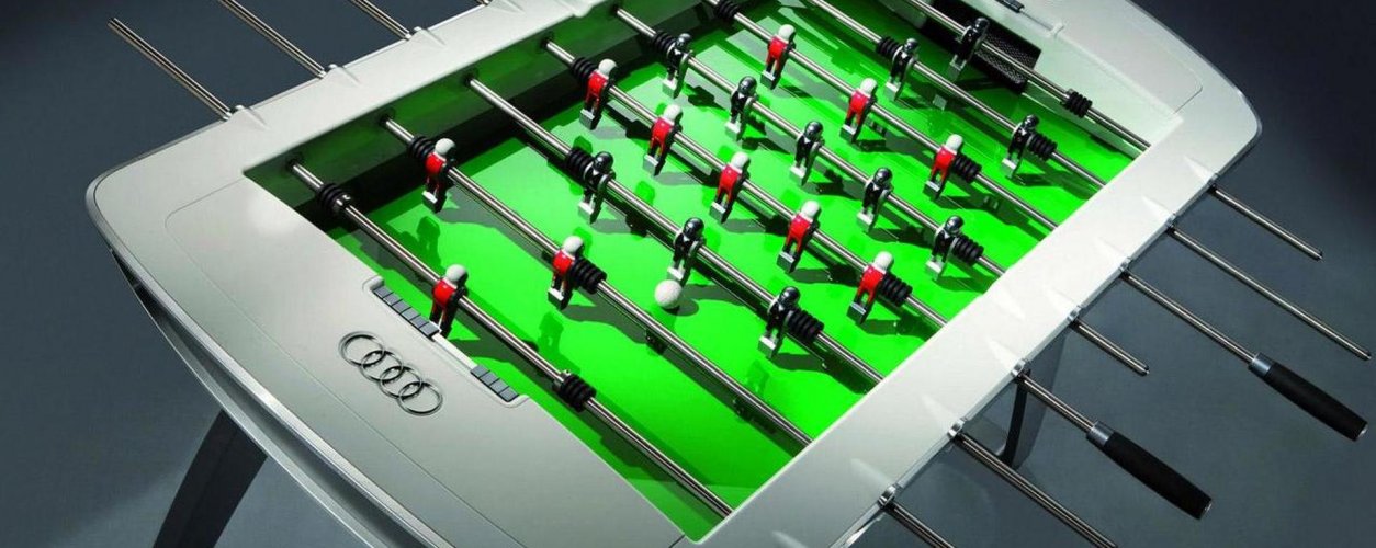 E agora que já forramos o estômago, vamos para o entretenimento. Esse aqui é um produto capaz de te levar para clássicos como Flamengo e Fluminense e Corinthians e Palmeiras. Depende, claro, da sua imaginação. A Audi Concept Design desenvolveu uma mesa de totó em parceria com a Leonhart.