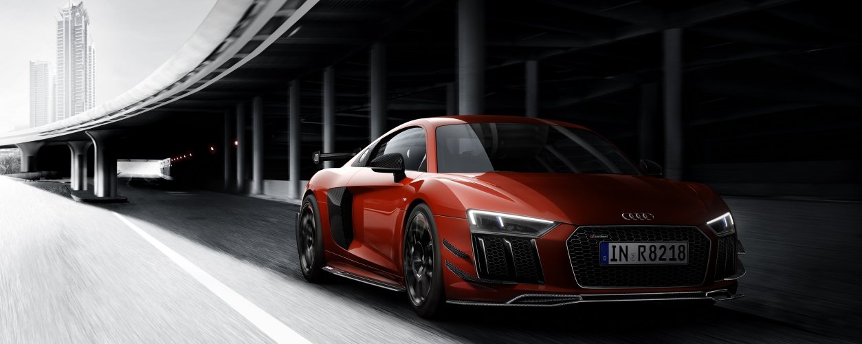 A segunda geração do R8 é, esteticamente, esportiva por natureza. Os traços, a altura, rodas grandes e, claro, o V10 instalado na traseira são os pontos altos. Mas a Audi não deve pensar assim e trata de adicionar ainda mais apelo ao icônico modelo. A marca colocou várias peças da Audi Sport Performance Parts. O intuito foi gerar mais pressão aerodinâmica e melhorar a dirigibilidade em curvas. Isso inclui um kit aerodinâmico plástico reforçado com fibra de carbono testado em túnel de vento, um asa traseira fixa maior, saias laterais, um massivo difusor traseiro e apêndices também em fibra de carbono para gerenciar o ar.