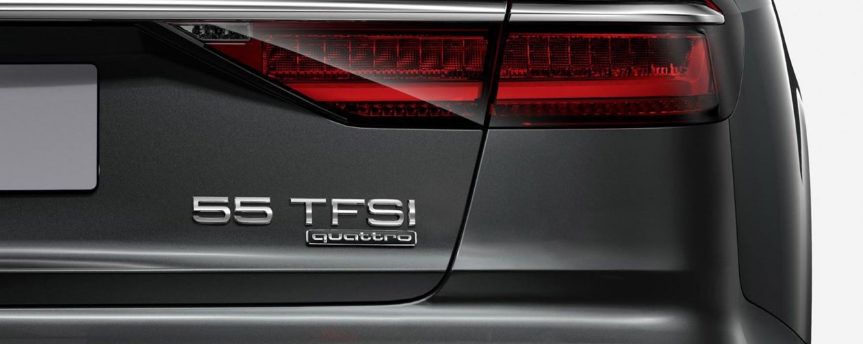 A Audi, marca premium do Grupo Volkswagen, divulgou que também vai colocar números na tampa traseira dos seus modelos, mas com uma "metodologia" um pouco diferente. A partir dos próximos lançamentos, a começar pelo novo A8, os modelos da Audi vão deixar de exibir a cilindrada na tampa traseira e sim números de dois dígitos, que vão de 30 a 70, posicionados à esquerda da sigla que designa a tecnologia aplicada no motor, que pode ser TDI (turbodiesel), TFSI (turbo a gasolina ou flex), e-tron (elétricos e híbridos) e g-tron (movidos a GNV).