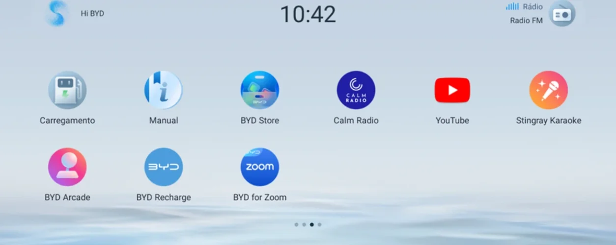 Entre as novidades da central multimídia da BYD, destacam-se a integração nativa com aplicativos como YouTube e Zoom, ampliando as possibilidades de entretenimento e produtividade dentro do carro. O Zoom permite participar de reuniões com segurança enquanto o veículo está parado, e o YouTube oferece momentos de lazer durante recargas ou pausas na viagem.