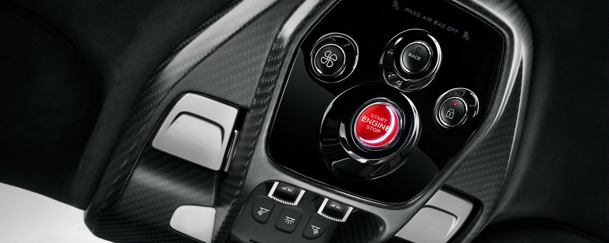 O carro criado para homenagear o piloto brasileiro tricampeão de Fórmula 1 não tem firulas no botão que dá vida ao V8 de 800 cv. O local que ele se encontra, por sua vez, é inusitado. Ele fica em um console no teto junto de outros comandos, como ventilação, fechamento/abertura das porta e vidros elétricos, além faróis.