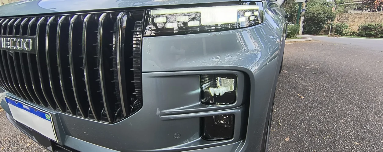 Trata-se de marca chinesa irmã da Chery, mas o SUV médio Jaecoo 7 chama atenção pela enorme grade de elementos verticais que lembram uma cachoeira. Há um contraste evidente com a discreta parte traseira, de lanternas interligadas e defletor de teto.