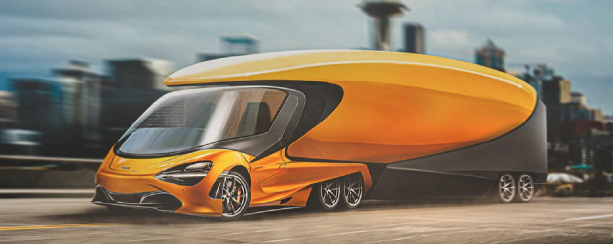 Achamos que o caminhão da McLaren tem uma das propostas mais estranhas desse comboio imaginário - ele usa a dianteira agressiva do 720S, mas também incorpora um gigantesco para-brisa curvo que se estende até o teto.