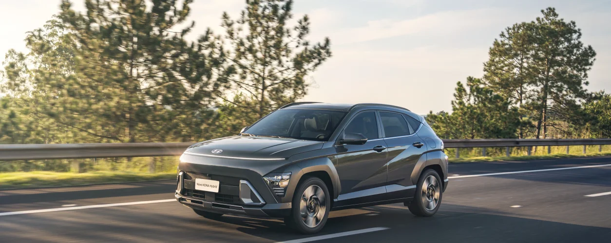 Mas o estilo do Kona híbrido não chega a comprometer o conjunto e chama atenção ao ser visto de perfil pelo desenho elaborado das rodas de 18 polegadas. Mesmo que as colunas traseiras tenham área envidraçada pequenas. A versão avaliada foi a topo de linha Signature.