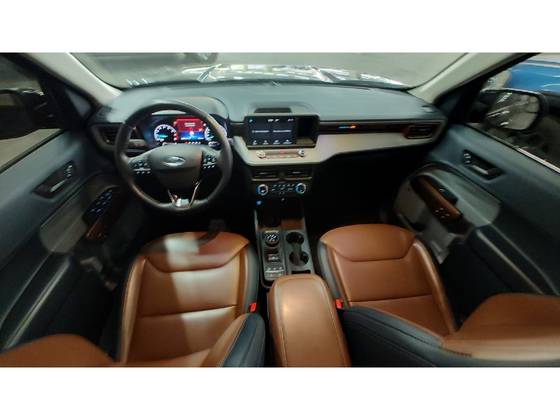 Na parte interna, a central multimídia tem tela maior de 13,2 polegadas. Sensores de proximidade ajudam ao estacionar. Boa posição de guiar, mais parecida com a de automóvel do que com o de uma picape. O espaço para os passageiros no banco traseiro rivaliza com modelos de maior porte. O acabamento explora diferentes materiais e texturas.