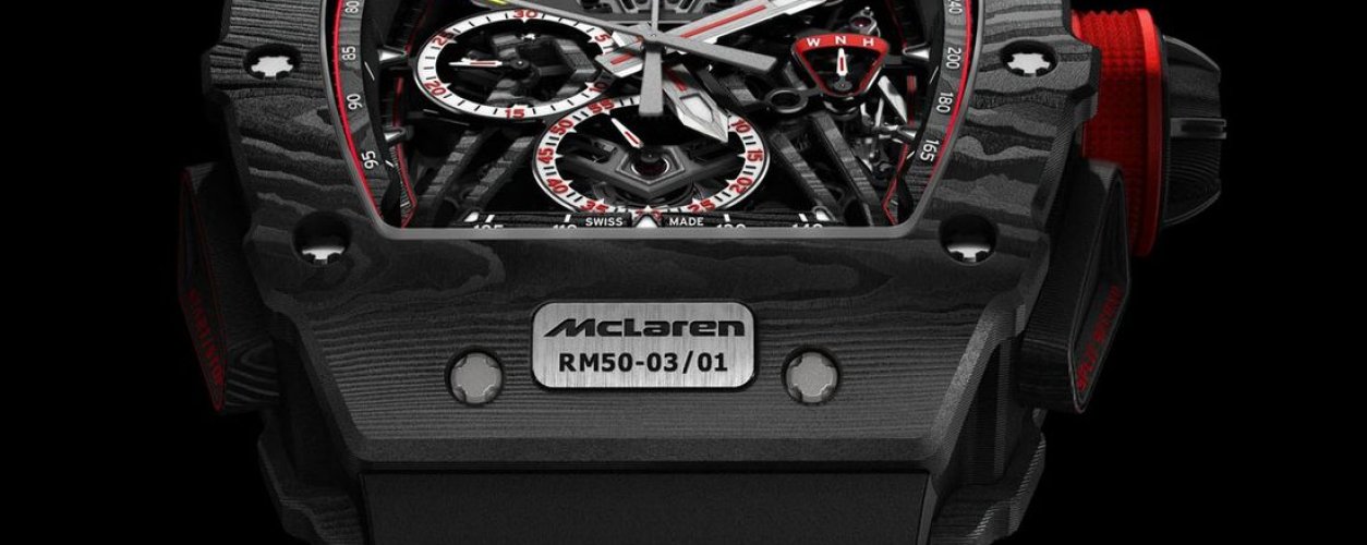 O próprio nome do relógio já é um cartão de visitas para mostrar que estamos falando de um acessório complexo: RM 50-03 Tourbillon Split Seconds Chronograph Ultralight McLaren F1. Ele foi apresentado no Salão Internacional de la Houte Horlogerie, evento focado em relógios realizado na Suíça que seria equivalente a um Salão de Genebra.
