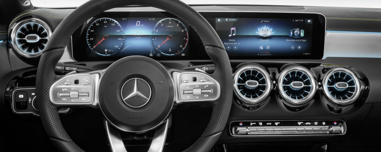 As telas são digitais de alta resolução com interface 3-D e o usuário pode interagir com o sistema pelo usual touchpad no console central, pela tela que finalmente é sensível ao toque, pelos botões no volante ou pelo comando de voz inteligente. Ele é inteligente porque é baseado no uso da Inteligência Artificial, o que significa que ele possui habilidade de aprendizado. Quanto mais o sistema e condutor interagem, mais o MBUX aprende sobre o motorista e se adapta ao seu modo de falar e a suas preferências.