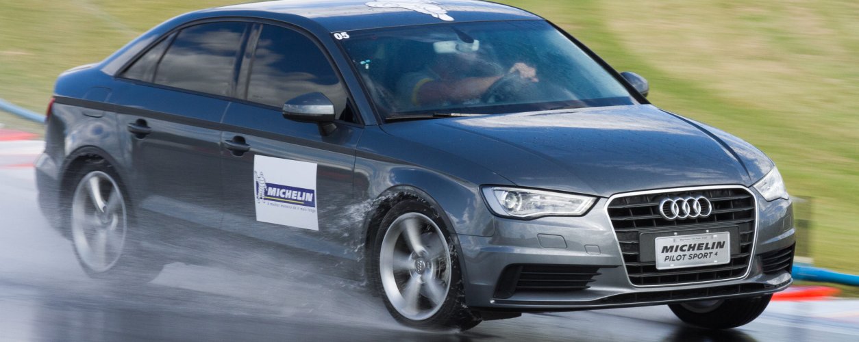 Depois, os participantes assumiram o controle do volante para dar uma volta completa no Velo Città, autódromo homologado pela FIA (Fcaptionação Internacional de Automobilismo). A bordo de um Audi A3 sedã, realizaram provas de slalom (zigue-zague) e frenagem para verificar o poder de reatividade do pneu, além de pisar fundo na reta da pista para notar toda a esportividade proporcionada pelo MICHELIN Pilot Sport 4.