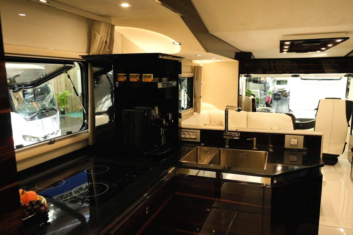 A cabine é bastante luxuosa, com salas de estar e de jantar, cozinha, quartos, banheiros e espaço para home office. A iluminação e os sistemas elétricos são alimentados por baterias de íons de lítio abastecidas por painéis solares de 2.000 W e um gerador de 8 kW, que permitem ao motorhome operar longe da rede elétrica por várias horas.
