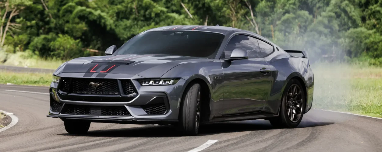 Para se destacar na multidão, o Mustang manual ainda tem detalhes exclusivos de design. Destaque para as faixas esportivas pretas com frisos vermelhos em toda a carroceria, cortando do capô até a traseira.