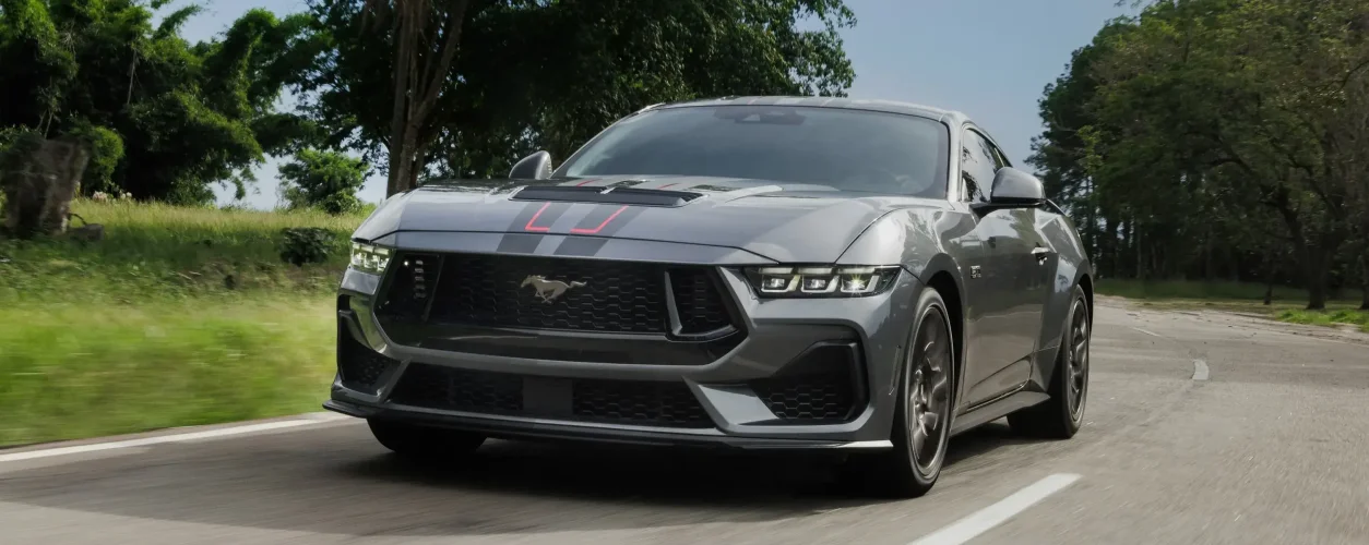 Para se destacar na multidão, o Mustang manual ainda tem detalhes exclusivos de design. Destaque para as faixas esportivas pretas com frisos vermelhos em toda a carroceria, cortando do capô até a traseira.