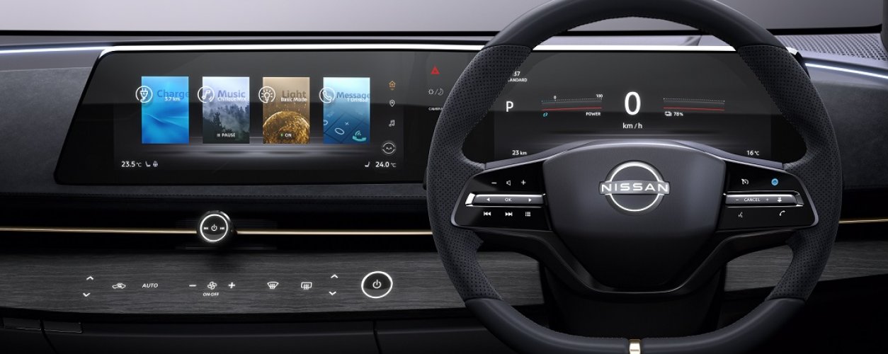 A tela da Ariya Concept mantém as informações de direção em um local do painel de instrumentos, semelhante ao de um carro tradicional. Ao mesmo tempo, exibe informações de entretenimento, controles de conforto e status do sistema na tela central.