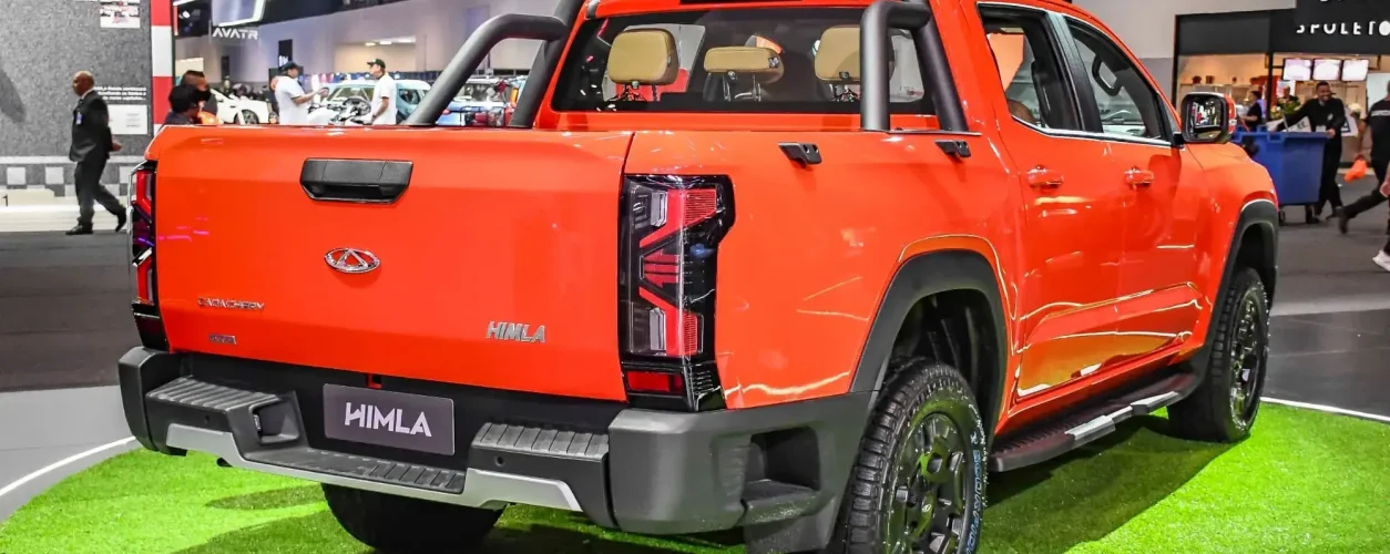 Construída sobre a plataforma KP11, a Himla utiliza arquitetura body-on-frame, típica das picapes médias voltadas para uso misto entre cidade e off-road. Suas dimensões impressionam: 5,33 metros de comprimento, 1,92 m de largura e 1,82 m de altura, garantindo porte robusto e espaço interno generoso. A capacidade de carga é de 1 tonelada, enquanto a de reboque chega a 3.500 kg, números que a colocam no padrão do segmento.