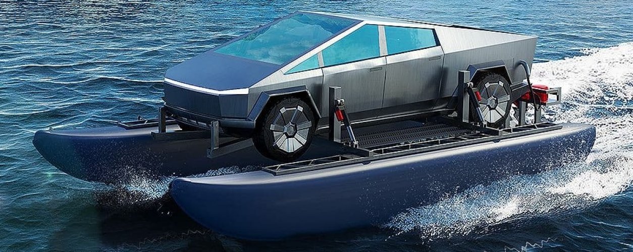 As picapes Tesla Cybertruck e sua provável irmã menor, a Cybercat, ainda estão em fase de testes de desenvolvimento e só deverão ser lançadas no ano que vem. Há grandes expectativas em torno dos dois modelos, que terão propulsão 100% elétrica e prometem ser uma revolução em aspectos como tempo de recarga e autonomia. Enquanto as novidades não chegam, surge uma nova hipotética aplicação para a Cybercat: um inventor americano projetou uma adaptação para que a picape se tornasse um catamarã!