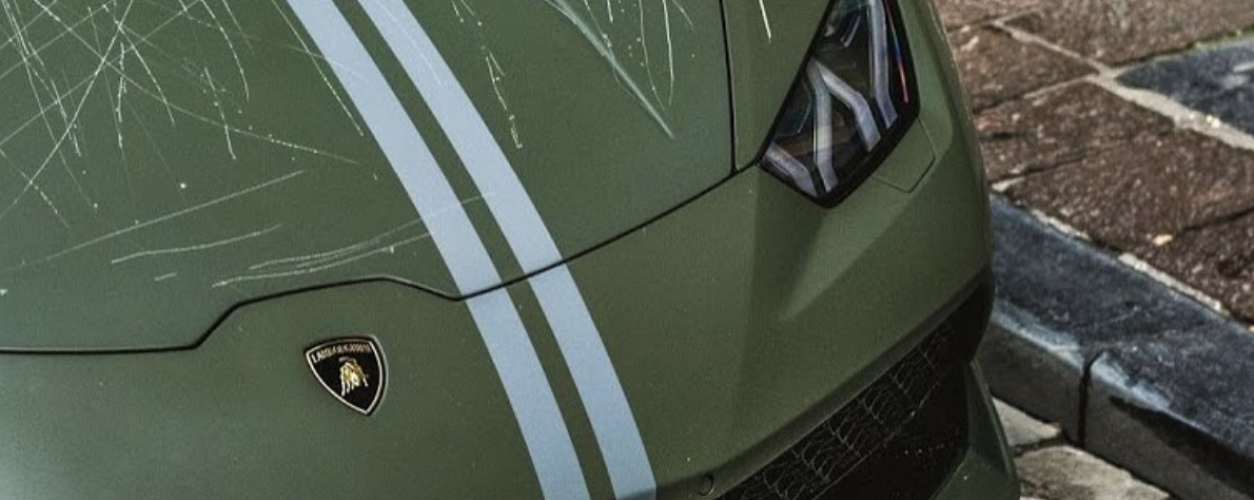 O condutor de um Lamborghini Huracán Avio, cupê com apenas 250 unidades produzidas, revolveu deixar o esportivo estacionado na rua em uma cidade europeia não identificada. Ao voltar para o carro, o motorista teve uma surpresa desagradável: a bela pintura verde-oliva com faixas brancas estava toda riscada, possivelmente com uma chave.