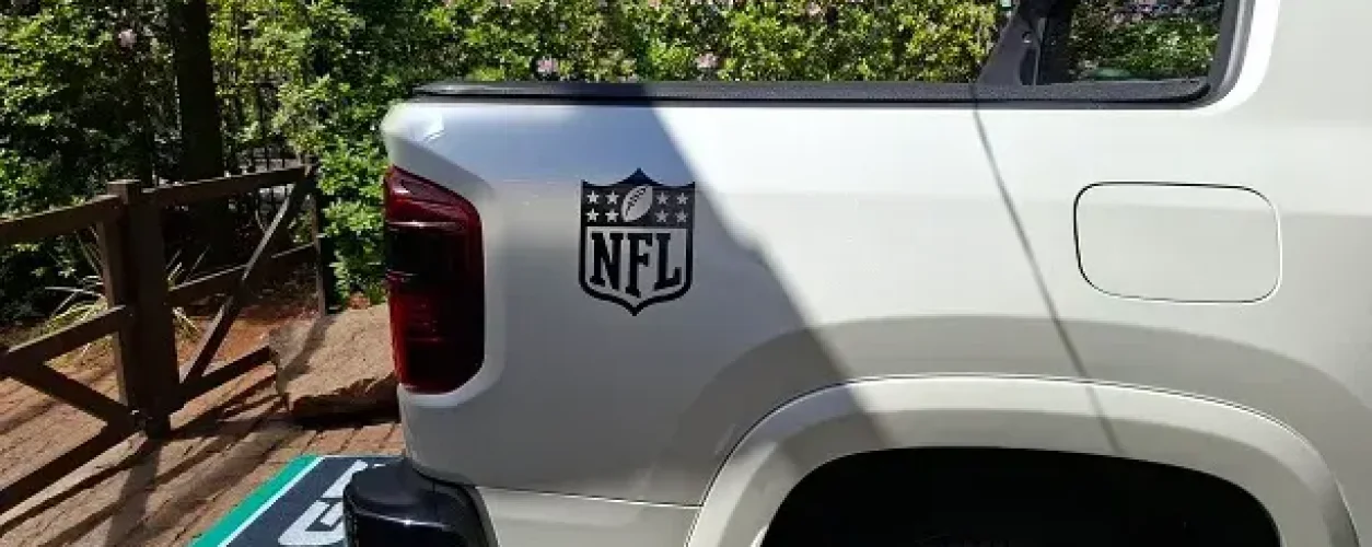 Visualmente, na parte externa, há grandes logotipos da NFL no capô e nas laterais da caçamba, dois badges exclusivos menores nas portas, maçanetas pintadas de preto e acabamento especial nas ponteiras de escape - que têm 4,5" e são pintadas em preto brilhante.