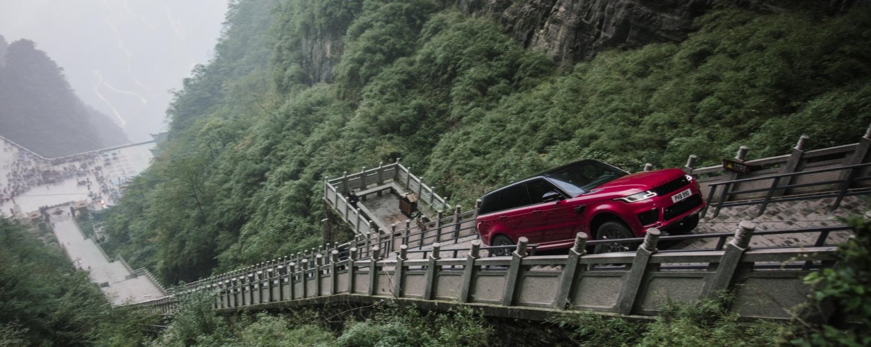 A Land Rover, que pertence ao mesmo grupo automotivo, colocou o Range Rover Sport PHEV, híbrido plug-in, para percorrer os 11,3 km da Tianmen Mountain Road, também conhecida como Estrada do Dragão, na China, e na sequência subir uma escadaria de 999 degraus até o arco de pedra natural Heaven's Gate, um ponto famoso turístico local. A marca anuncia que se trata do primeiro SUV a chegar no topo.