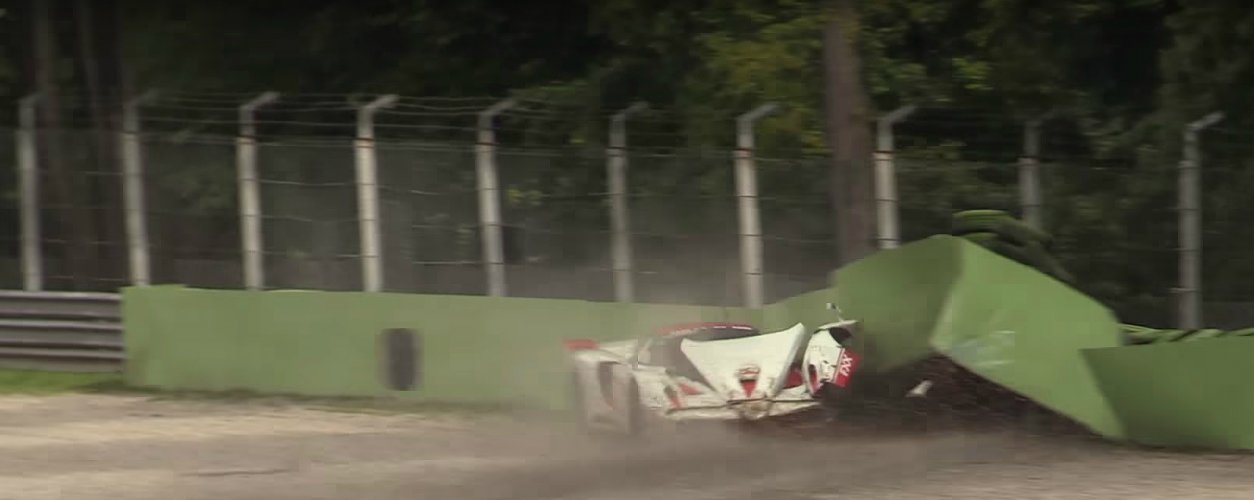 O acidente acontece no ‘S’ de baixa logo após a reta principal da mítica pista italiana. Logo na primeira ‘perna’ da curva, o piloto parece perder o ponto exato de frenagem e passa reto. Um dos pneus se solta e o motorista vira passageiro. A Ferrari só para após bater de frente com o muro de proteção do outro lado da pista. Importante destacar que o asfalto estava úmido no momento da colisão.