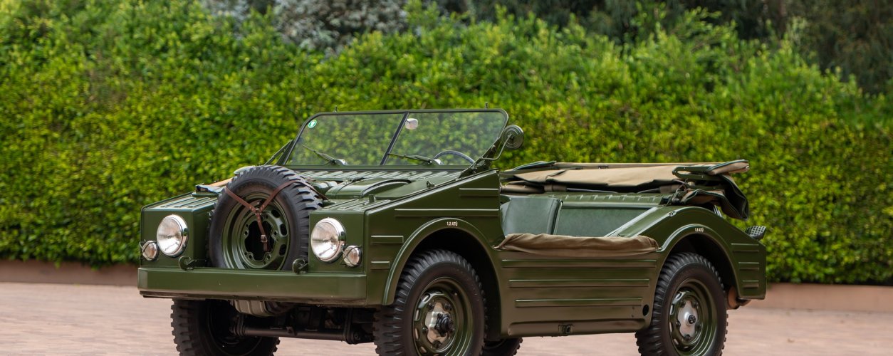 Voltando ao carro do leilão, o exemplar foi vendido em 1956 para um concessionário Porsche da Alemanha, e depois passou pelas mãos de vários donos. Totalmente restaurado, o carro tem pintura no tom verde usado pelos veículos militares alemães e uma capota de lona para oferecer proteção - mínima - ao motorista.