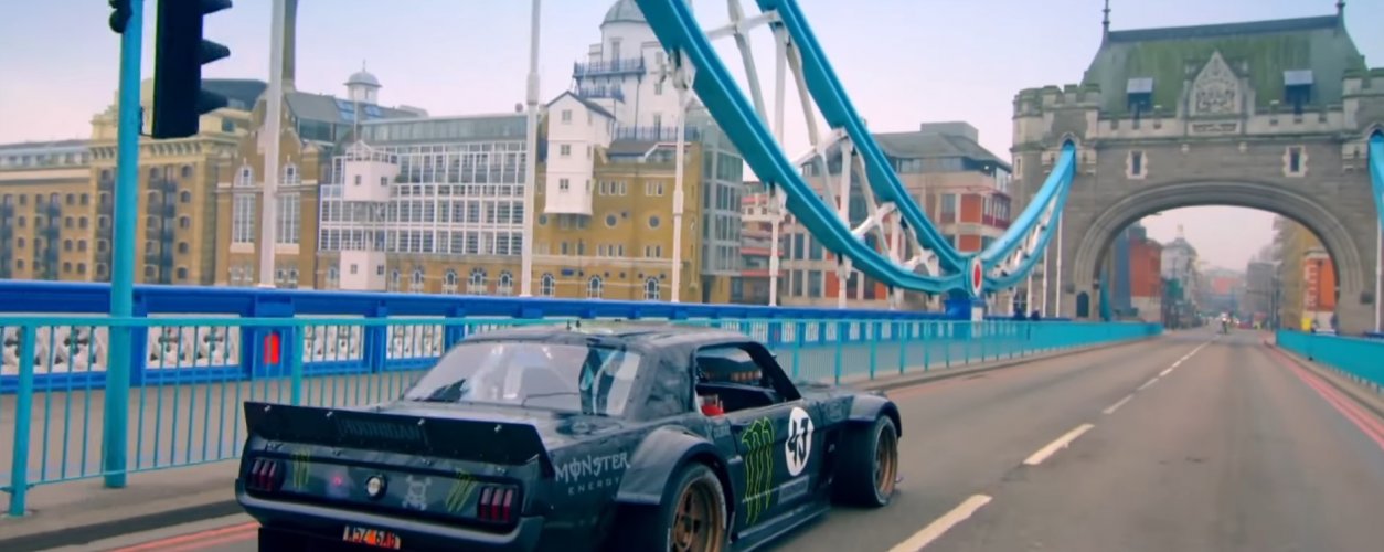 Não, esse não é o novo Gymkhana. Também não é uma produção inédita. Na verdade, é um rescaldo do que o piloto Ken Block fez em Londres, Inglaterra, na última temporada do programa Top Gear com seu Ford Mustang Hoonicorn. Nem por isso, o vídeo é menos empolgante.