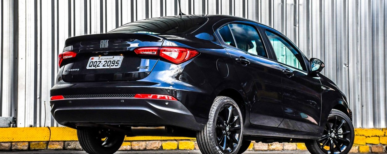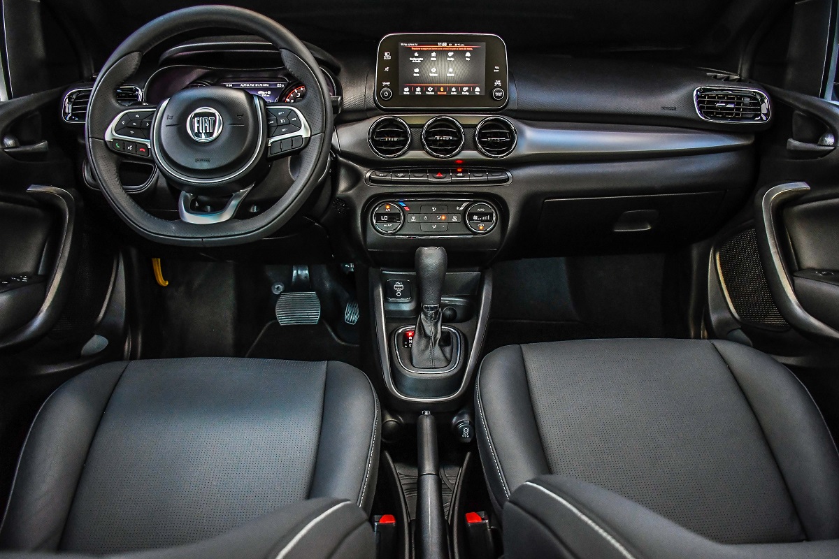 Já na traseira, tudo preto também. Símbolo da Fiat, nome Cronos e até AT6 em preto, mas com um leve cromado. Apesar de discreto, o spoiler na tampa do porta-malas em black piano é onde reside a maior ousadia do Cronos HGT. Ficou faltando uma saída de escape mais arrojada, com uma ponteira dupla ou mesmo cromada (fosca também seria legal).