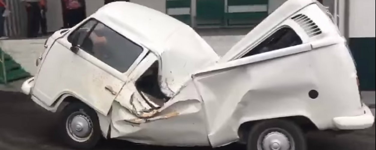 A Kombi é imortal? Começamos a acreditar que sim! Um vídeo divulgador nas redes sociais mostra uma Kombosa literalmente dobrada ao meio após ser atingida por um poste, mas que continua rodando como se quase nada tivesse acontecido.