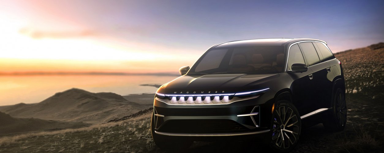 Os faróis de LED são bem afilados e se conectam por uma barra iluminada que acompanha toda a grade. O nome Wagoneer aparece escrito no capô e o para-choque tem detalhes cromados.