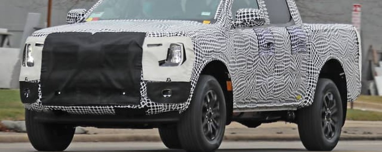 A camuflagem do protótipo flagrado em testes é forte, mas é possível ver claramente que a frente tem um design verticalizado, com uma espécie de "nariz achatado", assim como a F-150, que dá à picape uma estética mais ousada.