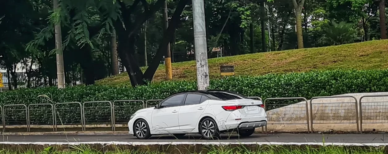 O novo Nissan Sentra já está no Brasil. Um modelo foi flagrado completamente sem camuflagens rodando na manhã deste sábado (14) pela Marginal Pinheiros, um dos principais corredores da cidade de São Paulo. O sedã estava acompanhado por agentes de trânsito, vans e um Porsche Cayenne de filmagem que produzia imagens para divulgação.