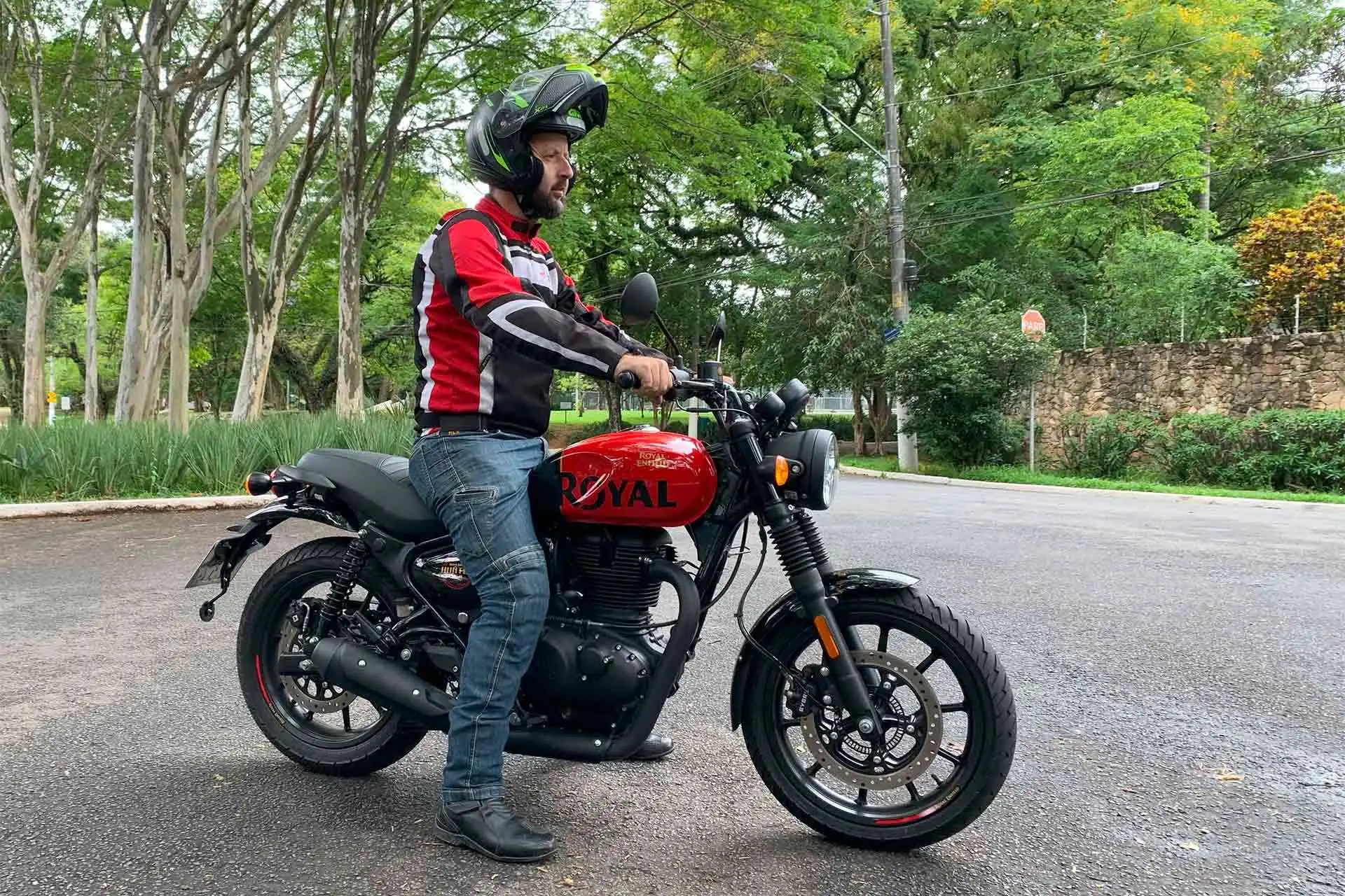 Os pneus da CEAT sem comportaram bem no teste, lembrando que essa é a única Royal Enfield até o momento com rodas aro 17polegadas na frente e atrás, que somam na agilidade da moto. Destaque para os freios, da Bybre, que tanto na dianteira quanto na traseira têm o sistema antibloqueio (ABS) e ótimo tato: passaram confiança para frear firme sem receio. É um dos pontos fortes dessa moto.